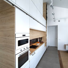 Internamente, la arquitectura revela una refinada estrategia espacial centrada en la verticalidad y el uso eficiente del volumen. Los espacios de doble altura y las geometrías de los techos inclinados introducen dinamismo espacial, manteniendo una estética sobria. La carpintería empotrada y la carpintería a medida, especialmente en la cocina, son parte integral de la arquitectura, difuminando los límites entre la estructura, el mobiliario y el almacenamiento. Las superficies blancas contrastan con la calidez de los elementos de madera natural, creando un diálogo equilibrado entre el minimalismo y la calidez doméstica.
